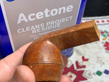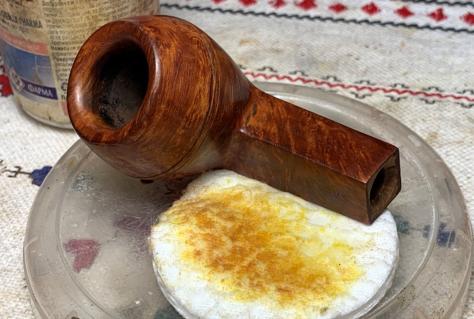 A cotton pad was used initially, but more muscle is needed. 0000 grade steel wool does a good job bringing things down to the natural briar.