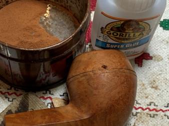 After the area is cleaned off with alcohol, a small drop of regular clear CA glue fills the pit. Briar dust is then sprinkled over the wet glue to give it some texture. The patche will be visible, but it is so small, it will look like a natural blip in the briar.