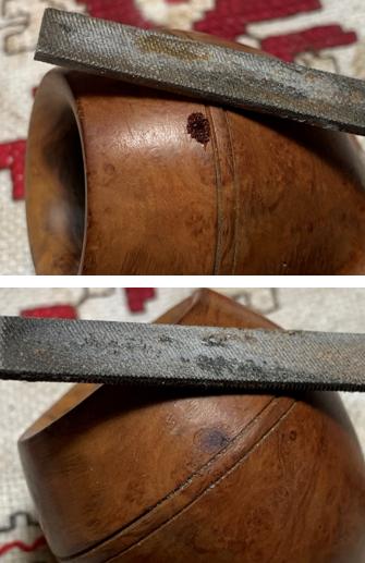 After the patch has cured, the flat needle file files it down flush with the briar surface.