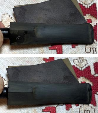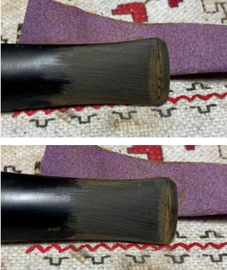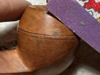 Since the Bulldog’s rim is canted – sloping toward the chamber, freehand sanding rather than topping is the procedure. The sanding starts with 220 paper.