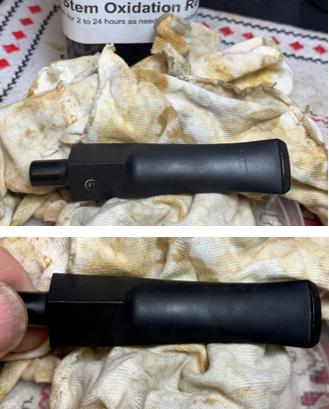 Before I can check this, the stem needs to be retrieved from the Oxidation Remover soak. When the stem is fished out, it is rubbed rigorously with a cotton cloth to remove the oxidation that was raised during the soaking process. The oxidation was light. Even so, the stem after the soak looks great.