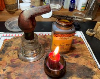When the stummel is warm, a folded pipe cleaner ‘paints’ a section of the stummel and the wet dye is then flamed. The lit candle contacts the wet aniline dye, and the alcohol combusts. The combustion burns off the alcohol leaving behind the dye pigment. This process of painting and flaming continues until the dye has been applied to the entire stummel. A second time around is done for good measure.