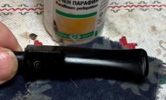 The vulcanite rubber is dry, and a mineral oil (Paraffin Oil) is used to help condition it. The oil is wiped on with a cloth.