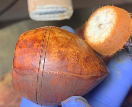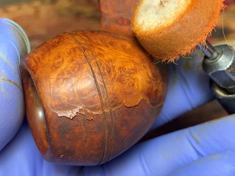 The stummel rested through the night. To unwrap the stummel, a coarse felt buffing wheel is mounted on the rotary tool with the speed set at about 40% full power. A more abrasive Brown Tripoli compound is used to ‘plow’ the flamed dye crust.