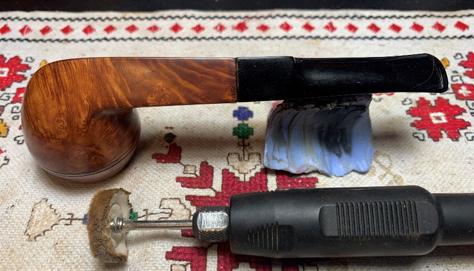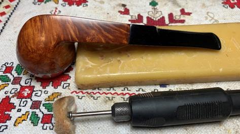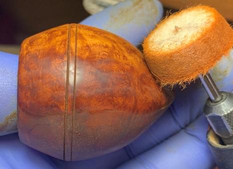 With another cotton cloth wheel mounted, next carnauba wax is applied to the entire pipe. After this is done, the pipe is given a rigorous hand buffing to remove excess wax and to raise the shine.