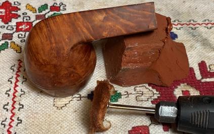 Next, the stummel is taken to the sink where hot water is used with liquid anti-oil dishwashing soap to scrub the internal mortise and airway. After the scrubbing, the stummel is thoroughly rinsed and brought back to the worktable.