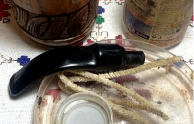 The next day the the wick and the salt show signs of the soiling indicating the tar and oils drawn out during the overnight soak. The salt is tossed and the remnants of salt crystals are removed from the bowl by rubbing a cotton bud like a broom on the chamber walls. I blow through the mortise to make sure no salt is left.