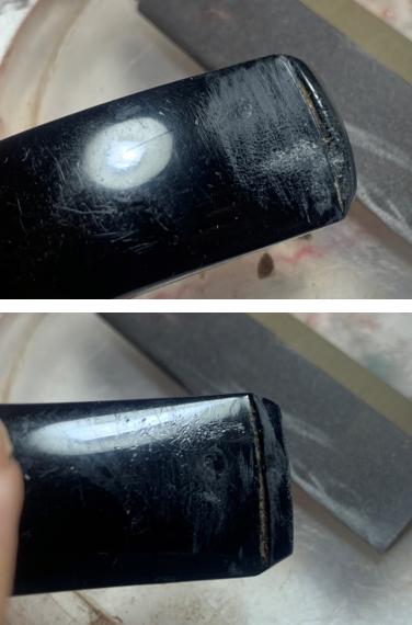The compressions will be patched using medium thick black CA glue. To prepare the surface, it is first sanded with 600 grade paper to rough up the acrylic so that the CA will have a better grip. The bit is then cleaned with alcohol with a cotton pad.