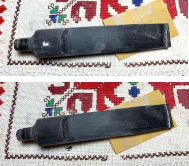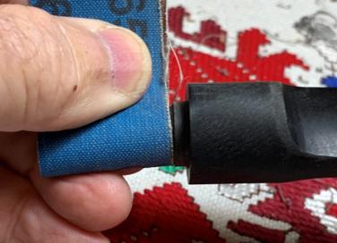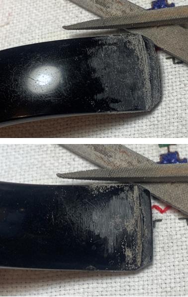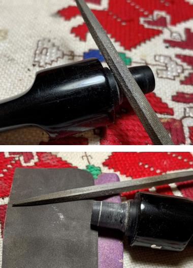 After the filing, the bit and button are sanded with 220 paper to erase the rougher filing tracks and to smooth the patch area.