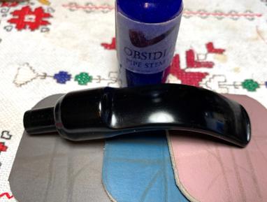 Following the general sanding, micromesh pads are used to sand/polish the stem starting first by wet sanding with pads 1500 to 2400. The wet sanding is followed by dry sanding with pads 3200 to 4000 and 6000 to 12000 grade pads. To condition the stem and to guard against oxidation, between each set of 3 pads, Obsidian Oil is applied and worked into the vulcanite. Wow – the pop looks good!