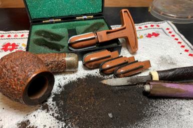 The inwardly canted rim was covered with a thick lava crust. The edge of the Savinelli Fitsall Tool scraped the crusting in the rim. This was done slowly and carefully to avoid gouging the rim’s briar.