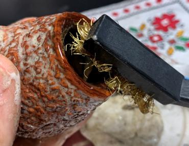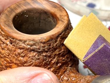 A brass wire brush is also used on the rim. The brass brush does a good job of removing the vestiges of carbon left. The bass does not hurt the briar by being too invasive.
