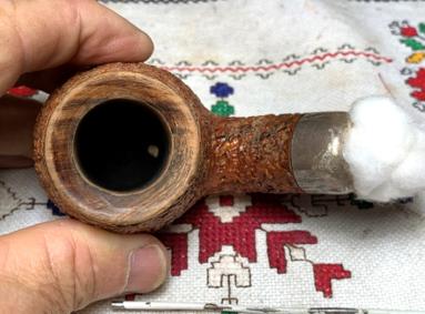 The internal cleaning continues with cotton buds and pipe cleaners moistened with isopropyl 99%. A small dental spoon is also used to scrape the mortise walls to remove the tar and oils. With the buds and cleaners coming out lighter, this phase is done. The cleaning will continue later with a kosher salt and alcohol soak.