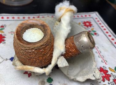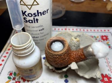 The cleaning of the internals continues with a kosher salt and alcohol soak. To form a ‘wick’ a cotton ball is stretched and twisted. The cotton wick acts as a wick to draw out the tars and oils in the internal briar.