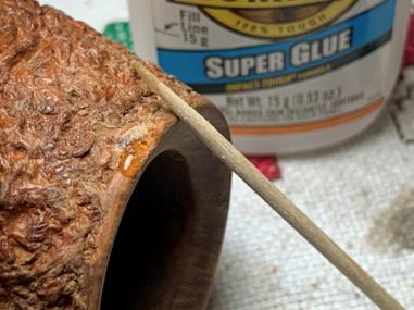 Regular, clear CA glue is used to patch the chip. Clear CA is used to allow the hue of the light briar to be seen through the patch. This will help the patch to blend. A toothpick is used to apply glue. To avoid applying too much, some CA is placed on the side of the tooth pick near the tip and gravity moves the glue to the tip. The tip is then touched on the patch and only a small amount leaves the toothpick. This allows for more control.