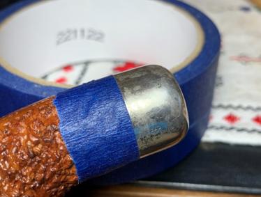Before applying the compound, the shank is covered with painters’ tape to protect the briar from the black substance that is generated by buffing the silver with compound.
