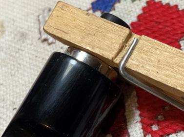Regular clear CA glue is used to cement the VP cap in place. Glue is placed on the toothpick and then applied to the step. I’m careful not to spread CA glue where it’s not needed around the tenon.