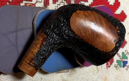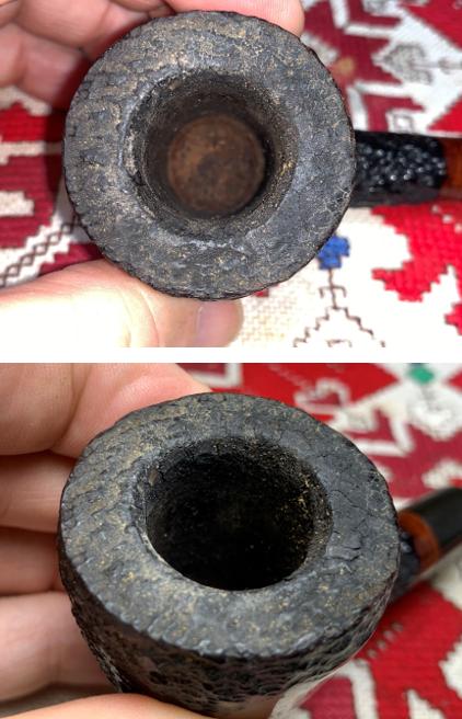 The rim is covered with a stubborn crusted lava flow. On the shank side of the rim the lava was hard embedded in the rustication and took a good bit of scrubbing from a soft brass bristled brush to see some improvement. The brass adds muscle to the cleaning, but it does not damage the briar.