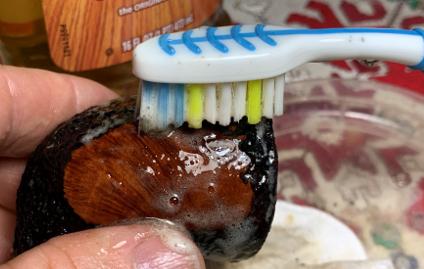 Moving next to cleaning the external rusticated surface and rim, undiluted Murphy’s Oil Soap is used to scrub with a cotton pad.