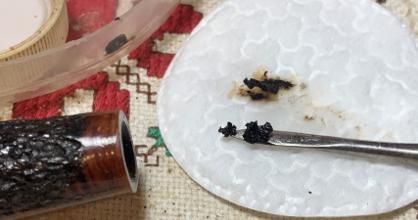 Continuing with the internal cleaning, cotton buds and pipe cleaners moistened with isopropyl 99% are used to do the job. Helping is a small dental spoon scraping the mortise walls excavating the tar and oils.