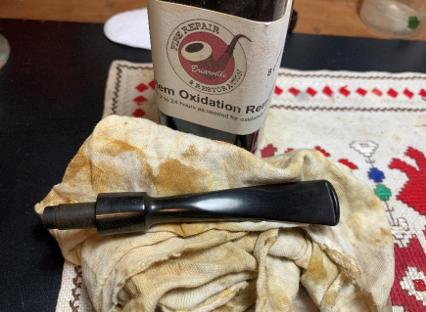 The stem has been soaking in a batch of Briarville’s Pipe Stem Oxidation Remover for several hours. The stem did not show oxidation, but the soak helps to make sure that the vulcanite stem is oxidation free. After the stem is fished out of the oxidation remover, it is rubbed rigorously with a cotton cloth to wipe away the oxidation that has been raised.