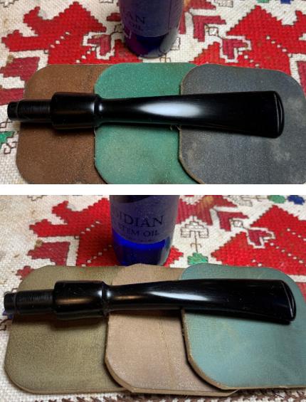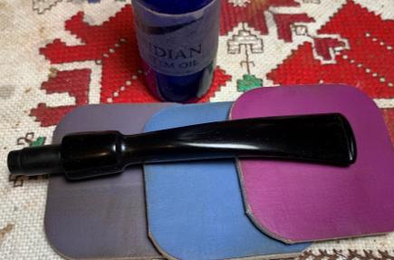 In the interest of full disclosure, after the sanding above, there were still some indications of the pinprick marks on the saddle. I returned to sand these with 220 grit paper, then 230, 600 and 0000 steel wool. There are still very minute marks on the saddle that can be seen, but I don’t want to sand more fearing that the saddle might become a bit out of shape. Next, the stem is polished/sanded with micromesh pads starting with wet sanding with pads 1500 to 2400. This is followed by dry sanding with pads 3200 to 4000 and 6000 to 12000. Between each set of 3 pads, Obsidian Oil was applied to the vulcanite stem to guard from oxidation and to condition the stem.