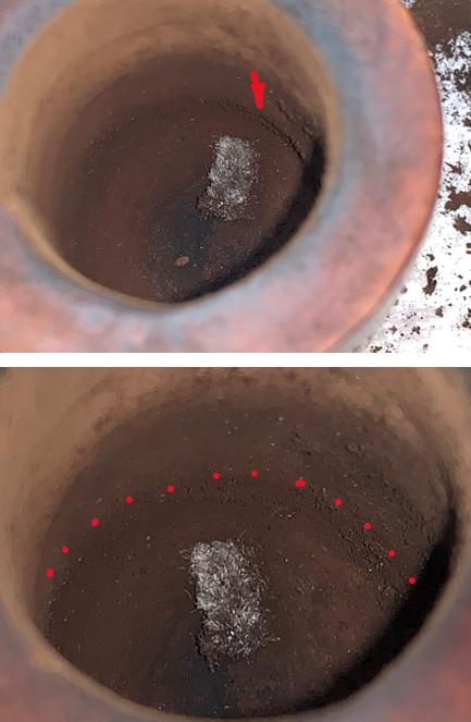 A few pictures show the progress and the condition of the chamber even though it is difficult to have ‘depth perception’ of the positioning of the chamber. The pipe cleaner marks the draft hole and a ridge can be seen which marks the place where the digging out of charred wood was progressing toward the shank. The ridge is marked by an arrow. In the second picture, the red dots show the general edge of where the bulge is located toward the shank.