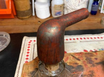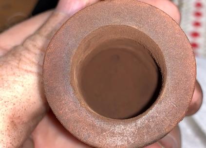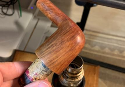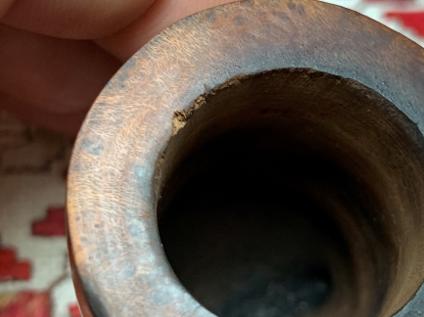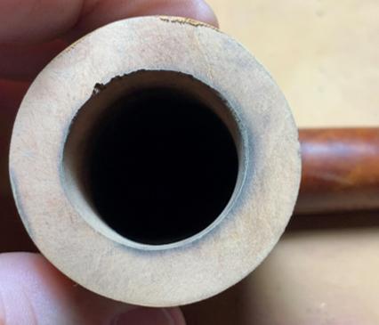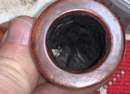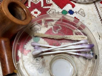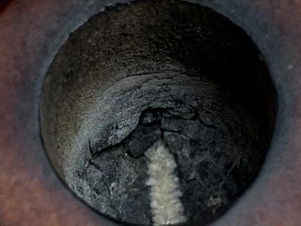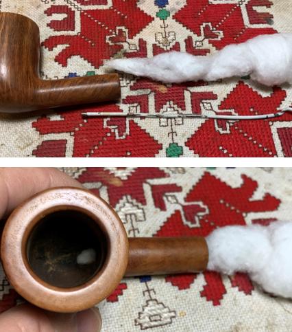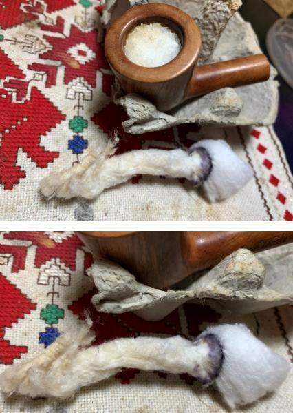 A pipe cleaner is inserted through the draft hole to keep the mud out. Once the mud has been spread, the stummel is inverted and allowed to dry. The mud dries into a surprisingly tough layer and provides the new steward with a starter for a new cake. A healthy cake only needs to be the depth of a US dime. WARNING for the new steward: After putting the pipe into service, DO NOT use a metal pipe tool to scrape the chamber! This will remove the Pipe Mud starter. Instead, simple rubbed the chamber wall with a folded pipe cleaner for several sessions to allow the cake to develop 😊.