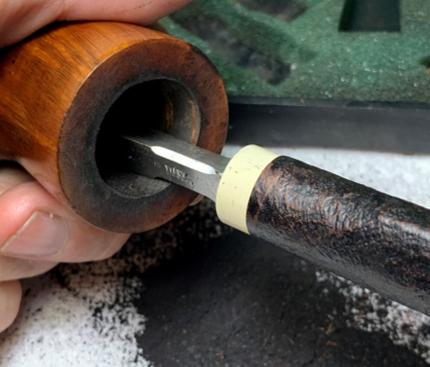 Starting from the top and working down, the stummel is topped to clean the rim and reduces the charring footprint. It also reduces the chipped area on the inner rim.