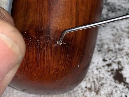 Next, I want to see if the fill on the exterior which is surrounded by darker briar is a burn through. If so, it’s important to determine where it burned through on the internal chamber side so that it can be properly addressed and repaired. The good news is that when digging with a sharp dental probe, the briar behind the pit is solid. I was expecting to see the probe to appear in the chamber! It is indeed a fill, and it doesn’t go through. That is GOOD news indeed, but the darkened briar means that the bowl was overheated.