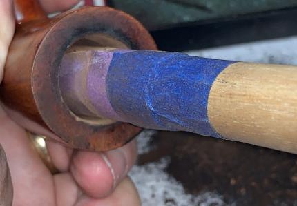 Using isopropyl 99% alcohol and kosher salt the internals are given further cleaning. A cotton ball is pulled and twisted to form a ‘wick’ that is inserted into the mortise and airway with the help of a firm wire which I cut from a wire hanger. The ‘wick’ helps to draw out the tar and oils from the internal briar. I’m hoping that it will also draw out the purple coating that is in the mortise. What I discovered on closer examination is that the coating with the purple stuff is only as far as the tenon would be engaged in the mortise. It would not get into the hot air passing through the airway. This was my main concern when I discovered it.