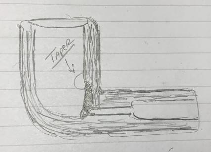 It’s difficult to picture the chamber to convey what is going on, so I employ some artistic skill to explain. In the sketch below, above the draft hole, the darker coloring represents the charred briar that was removed. At the top of this area, with a circle, is what now juts out unevenly since the briar beneath is gone forming a rounded indented area. Since the bad wood has been removed and there are no fissures or cracks evident, repairing with JB Weld isn’t the best approach at this point. What makes more sense is to smooth the area circled in the sketch to fashion a more tapered descent into the chamber. The possible downside to this is that the tobacco may not burn down evenly as the draw dynamics have been somewhat altered. This isn’t ideal but provides the path for this Ben Wade to have another life.
