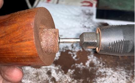 The next morning, the newly dyed stummel rested through the night. To ‘unwrap’ the crusted flamed surface, a coarser felt buffing wheel is mounted on the rotary tool with the speed set at a bit slower than the normal 40% full power. I put on a new felt wheel because after a while, they lose their suppleness. The speed is slowed to avoid too much friction on the briar surface. Brown Tripoli is used to plow the crusted flamed shell encompassing the stummel. During the process, the felt wheel is purged a lot on the edge of the chopping board that serves as a lap board while I use the rotary tool. This purging helps to keep the wheel soft.