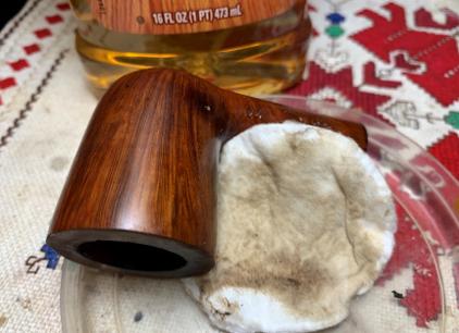 Next, the stummel is wiped with alcohol and a cotton pad. This is done to remove excess dye and to blend the new dye over the surface. It can also lighten the hue a bit.
