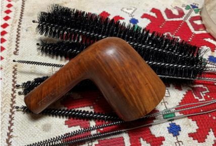 Next, the stummel is taken to the sink using warm water and liquid anti-oil dishwashing soap, shank brushes work on the internals of the stummel. After a scrubbing, the stummel is thoroughly rinsed and brought back to the worktable.