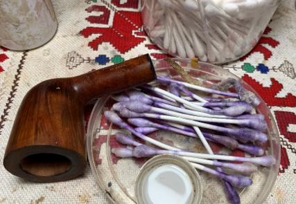 Continuing with the internal cleaning, cotton buds and pipe cleaners are moistened with isopropyl 99% alcohol. Well, as the picture shows below, the internals were treated with purple stuff. I’m not sure what it is, but its been there a while. The progress of cleaning did show some improvement, but the purple stuff is still there. The decision is made to bring this phase to a halt with the intention of giving the stummel an alcohol and kosher salt soak later to see if this will draw out the purple stuff…