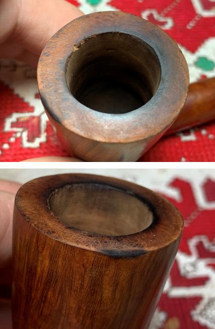 When I the Ben Wade made it to the worktable to take a closer look, I found an issue that is daunting. The chamber has significant heating and charring issues so much so that there appears to be a small burn through on the right side that I hadn’t noticed before. Here are pictures of the Ben Wade when I first received the pipes from John.