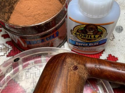 Regular, clear CA glue is placed on the pit and then sprinkled with briar dust. The dust helps to blend and to cure the patch.