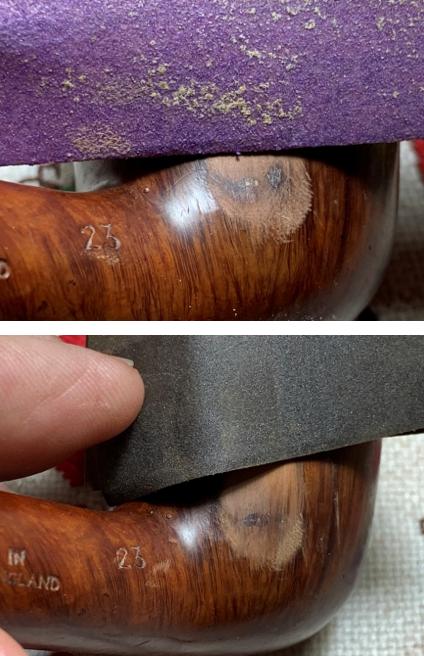 Next, the 220 paper is exchanged for 600 grade paper and the stummel is rotated several more times. The results are good.