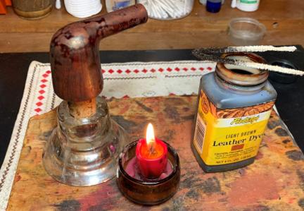 We’ve come to the time of decision. The plain truth is that the dark area from heating damage bothers me, and I wouldn’t want to look at it amid the beautiful vertical flame grain that this Ben Wade displays. The grain is the wow factor that this Dublin has going. The decision is made to apply Fiebing’s Light Brown Leather Dye to help mask the problem area. The upside of applying a dye, is that it has the potential to ‘pop’ the grain even more.