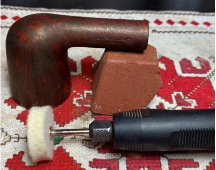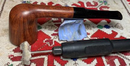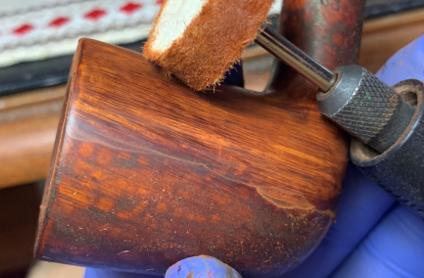 After a few hours, the Pipe Mud has thoroughly cured, and next Carnauba is applied to the pipe. Using a dedicated cotton cloth wheel mounted on the rotary tool, the wax is applied. Afterwards, the pipe is given a rigorous hand buffing to remove excess wax and to raise the shine.