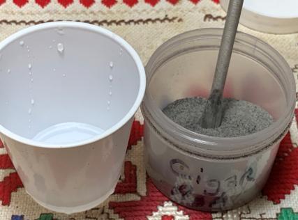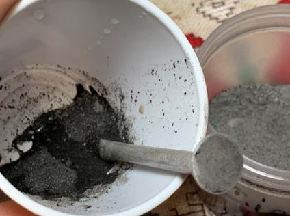 Using a pipe nail tool, ash is shoveled into the water and mixed. The mud thickens as more ash is introduced and mixed in. When the viscosity of the mud does not run (like molasses), the pipe nail is used to trowel the mud and spread it evenly around the chamber.