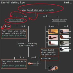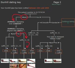 The first question is regarding the patent number. This number matches ours. In the next test, neither DUNHILL stamping option fits so we follow the ‘no’ path. This pathway gives 1950 plus the dating suffix which is 4 for us. This places the dating of this Dunhill at a grand age of 70 – 1954. The Dating Key then provides examples of Dunhills made during that period.
