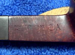 MADE IN ENGLAND followed by the dating indicator – an underlined 4: 4 [over] PAT. No. 417574/34. To the right of this is a circled 4 which is an indicator of size: medium to large. I would say that we are in the large category with our Bulldog. The ‘A’ we’ve already referenced above pointing to ‘best quality’. The patent was difficult to make out but after taking several photos at different angles, I think we have the correct number. The picture below shows the classic Dunhill logo – the white dot is in good shape.