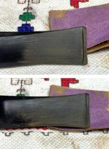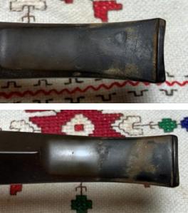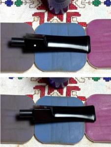 The first approach is to minimize the compressions so that only sanding is needed and not a patch. Using a Bic lighter – my small one ran out of gas… the sides of the bit are painted briskly with the flame to heat the vulcanite. As the rubber heats, it expands to recover its original disposition – or, closer to it. The heating method helped.