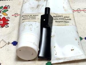 To more fully condition the stem, next Mark Hoover’s ‘Before & After’ Fine and Extra Fine Polishes are used. First, a small dab of the Fine Polish is placed on the finger and then is worked into the vulcanite stem. After this is thoroughly done, I let it set for a few minutes and then wipe if off with a paper towel.