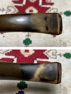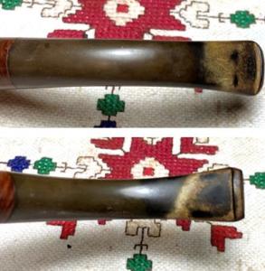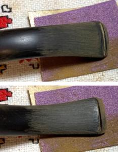 Using the heating method, to minimize the compression, the bit is painted with the flame from a Bic lighter. As the vulcanite rubber heats, the physics takes over and the rubber expands to reclaim its original form – or closer to it. The flame is painted quickly back and forth over the surface to avoid burning or charring the rubber. I’ve learned the hard way that too much flame in one place can cause problems. The compression has been minimized enough that simple sanding should erase it without needing to patch it.