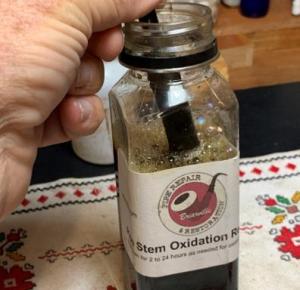Next, the stem is placed in www.Briarville.com’s Pipe Stem Oxidation Remover for several hours to address the oxidation.