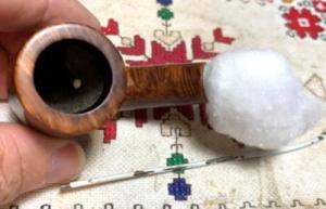 Before progressing further with the stummel, the internal cleaning continues with an alcohol and kosher salt soak. This passive cleaning helps to draw out the tars and oils in the briar, to remove ghosts of the past and refresh the briar. A cotton ball is used to form a wick.