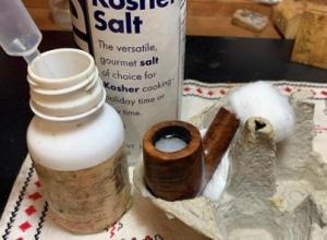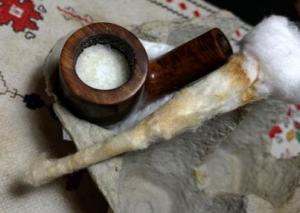The next day, the stummel soaked through the night in an alcohol and kosher salt soak. The picture shows the soiling in the salt and the cotton wick as the oils and tars are drawn out of the briar.